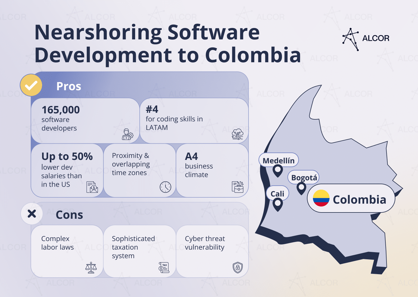 So, what are the pros and cons of nearshore outsourcing to Colombia? Take a sneak peek at the picture below to find out.